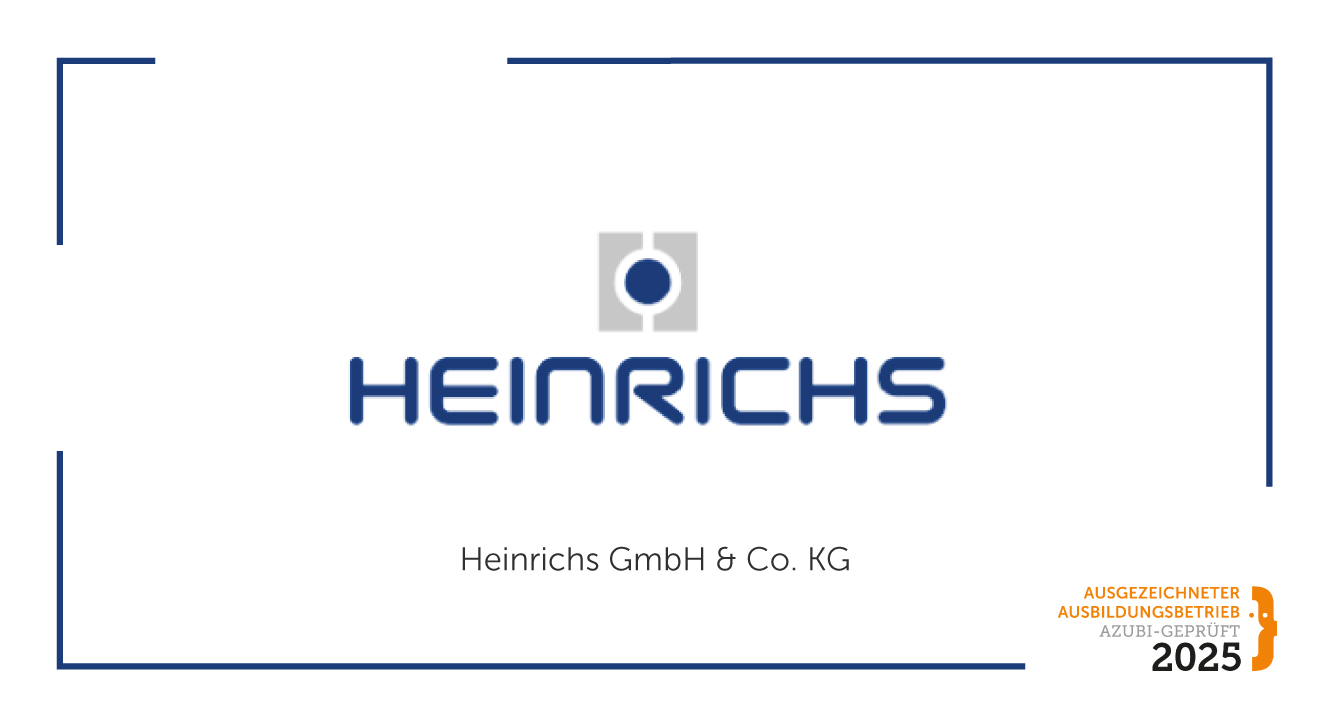 Die HEINRICHS GmbH & Co. KG wurde 2025 erneut mit dem Qualitätssiegel „Ausgezeichneter Ausbildungsbetrieb“ zertifiziert – nach Auszeichnungen in 2013, 2014, 2019 sowie 2021 bis 2023.